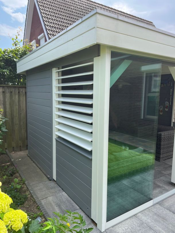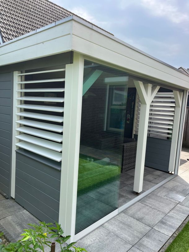 De zijwanden deels betimmerd in dezelfde stijl als het bestaande en daarboven draaibare shutters.