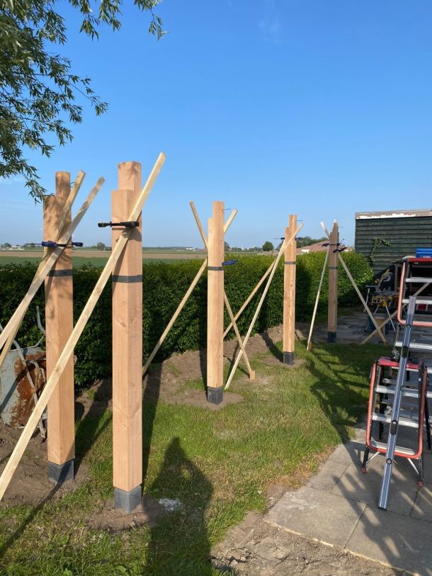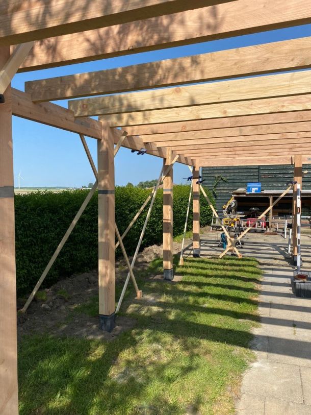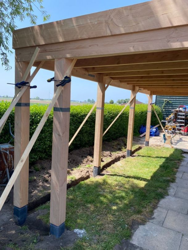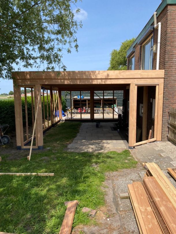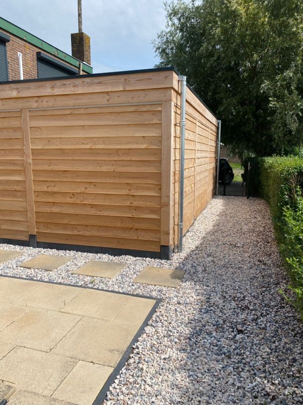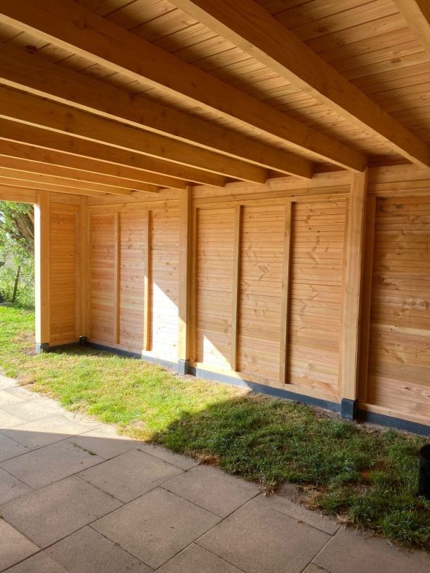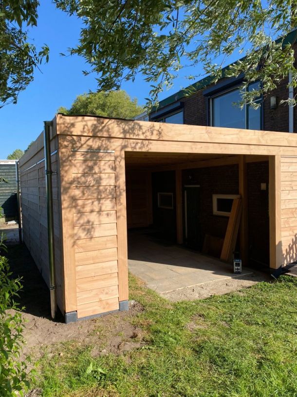 Een schuur achter de woning voor extra opbergruimte en voor het beoefenen van de hobby, dat wilde deze klant. Geheel uitgevoerd in bezaagd Douglashout, de constructie en de wanden. 8×5 meter dus aan ruimte geen gebrek. Gekozen voor bitumeuze dakbedekking mooi afgewerkt met antraciete daktrim en zinken regenpijpen.