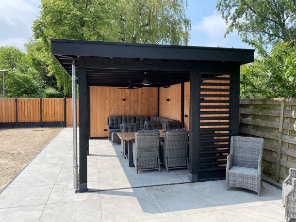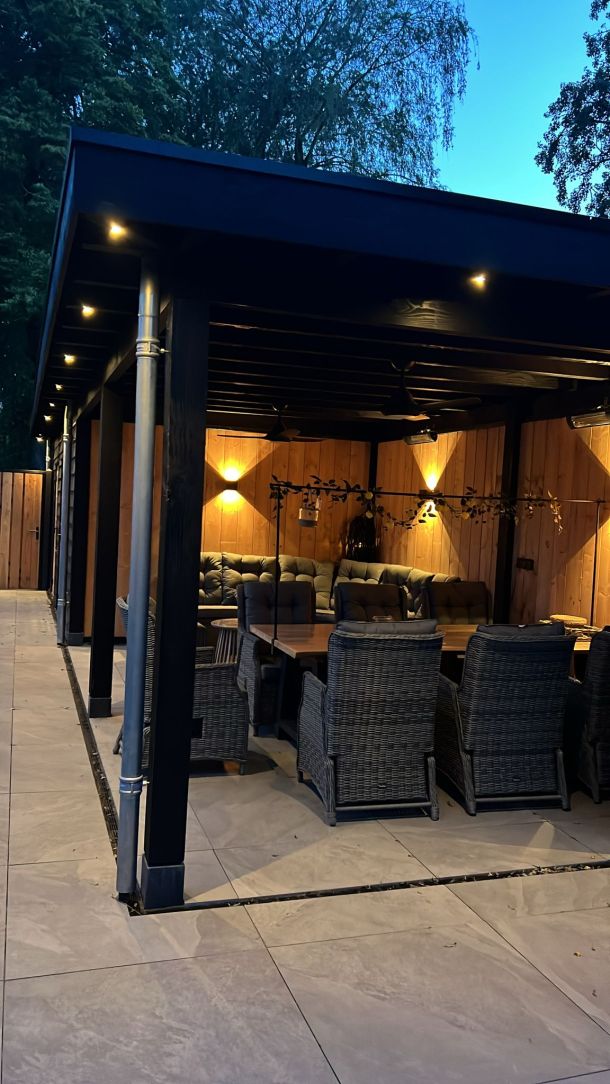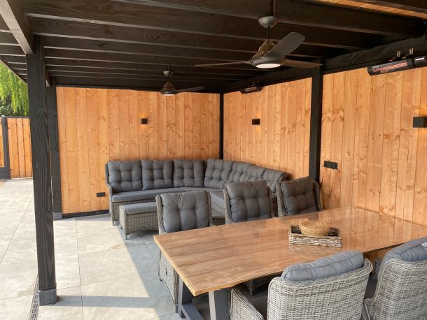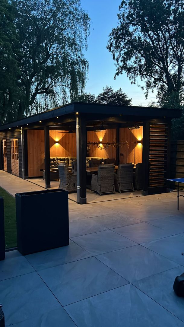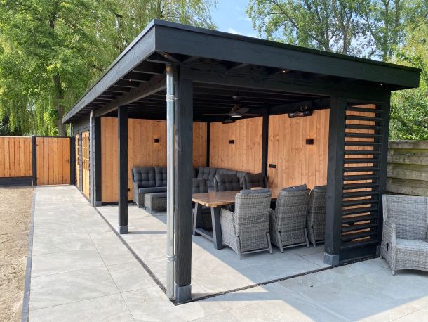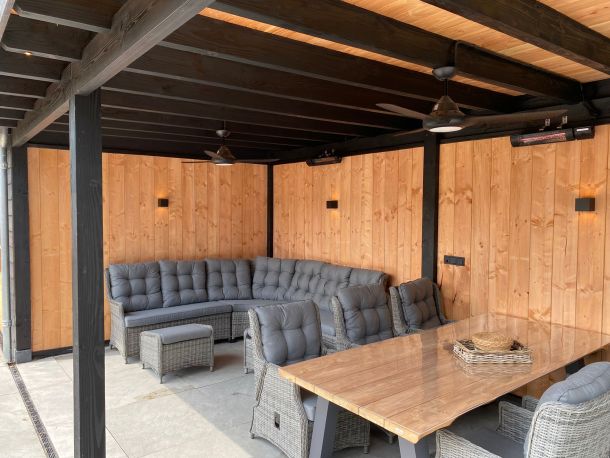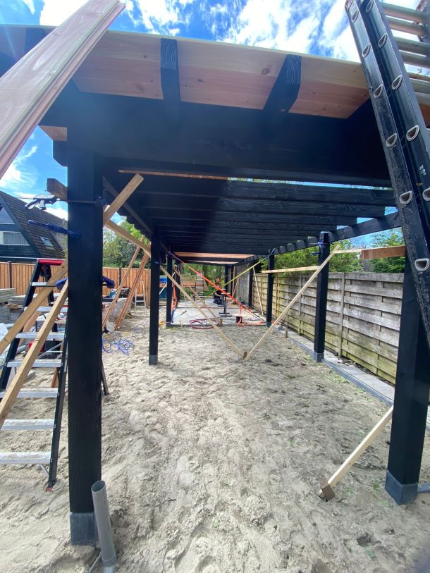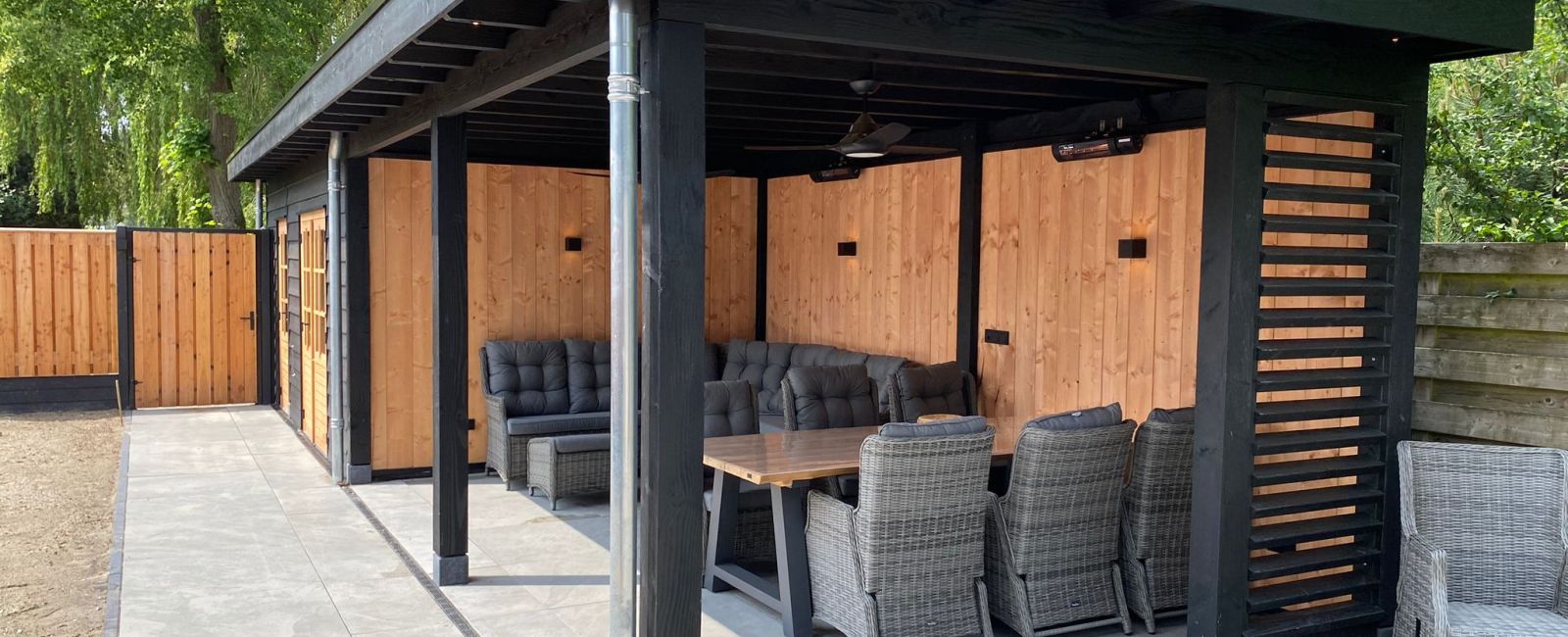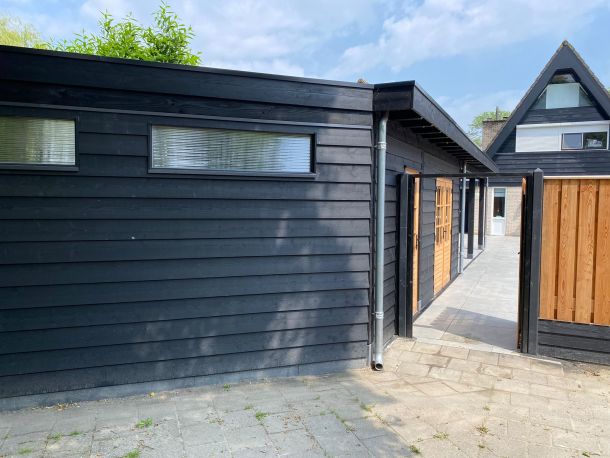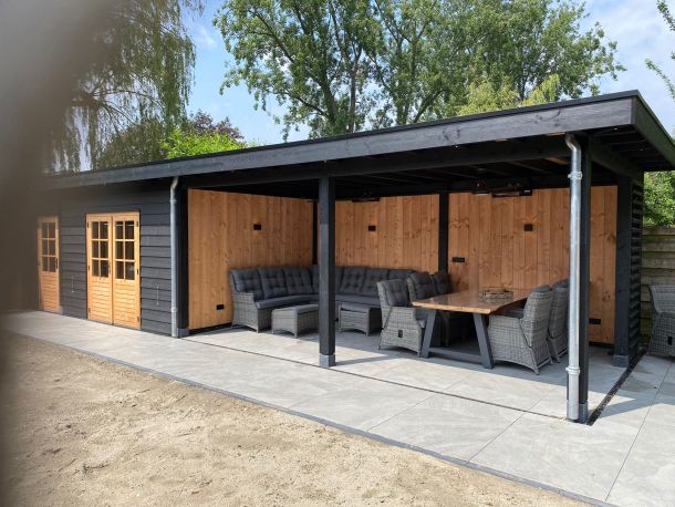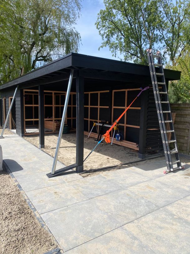 Naast de overkapping een schuur met dubbele deur en daarnaast nog een ruimte die als mancave gebruikt gaat worden.
