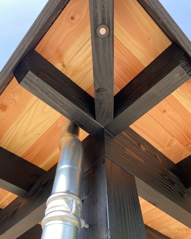 De gehele constructie zwart gebeitst, wat mooi in combinatie met de Douglas wandbetimmering en het dakbeschot.